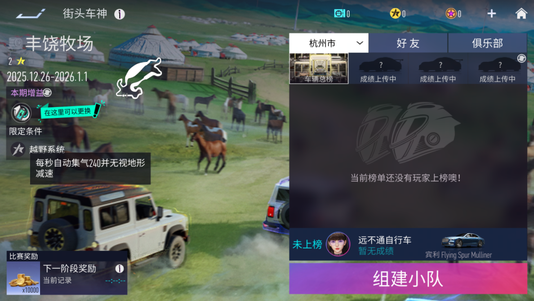 街头车神『层楼千落』将于2025年12月25日23:59结束,街头车神『丰饶牧场』将于2025年12月26日8:00开启。本期街头车神增益为充能装置、加速装置,特殊规则-越野系统:每秒自动集气240并无视地形减速。