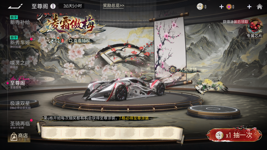 宝剑锋从磨砺出,梅花香自苦寒来!12月26日起,水墨丹青系列至尊涂装『寒霜冰魄-凌霜傲梅』携赛车『寒霜冰魄』降临至尊阁!使用专属道具至尊符,7抽必得全部奖励!专属背景、专属局外特效、专属标签、专属至尊芯片等你来拥有!集齐系列全部涂装更将解锁动态标签、闪卡、四象名片夹、炫彩滤镜、水墨丹青动态称号,将至尊进行到底!
