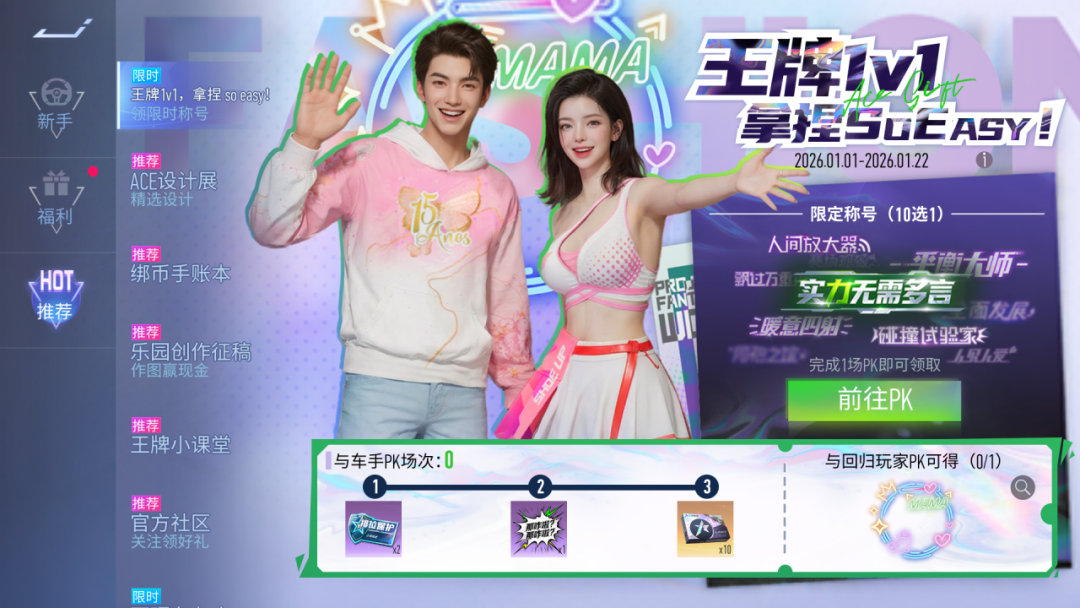 拿捏so easy!1月1日起,完成PK即可领取限时称号自选礼包!与好友完成多次PK还可领取排位保护卡、车贴、万能零件等好礼!
