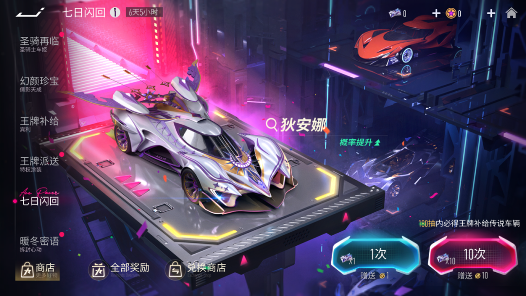 1月2日起,王牌补给将开启七日闪回活动!赛车狄安娜、阿波罗、黑曼巴、奥迪 RS6、讴歌 NSX、地狱火、隐刺将依次限时概率UP提升至66%!车手们不要错过中意的赛车,来提车回家吧!
