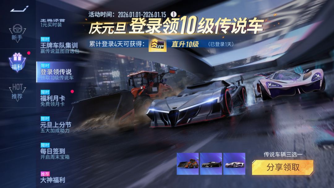 庆新年,登录领10级传说车!1月1日~1月15日期间,登录速度节即可领取其中一辆传说赛车:开拓铁铲、刹那、幻蝶。累计登录4天,还可以获得一张10级直升卡,各位车手不要错过!