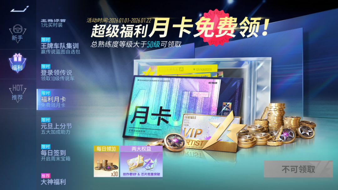 新的一年,超超超级福利来了 !1月1日~1月22日期间,登录速度节即可免费领取一张月卡,领取后您将获得:每日30纪念币(持续30天)、创作者VIP权益、芯片批量突破权益。若您已经是月卡用户,领取成功后将自动延长30天月卡。各位车手快来速度节一起庆祝新年吧!(ps:福利月卡总熟练度达到50级后可领取)
