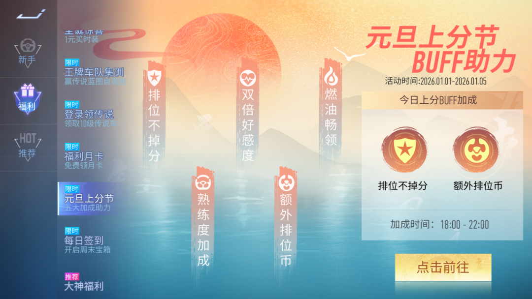 元旦上分节,五大加成助力!1月1日~1月5日,每晚18:00-22:00登录游戏即可享受排位不掉分、额外排位币、双倍好感度、熟练度加成、燃油畅领等不同加成奖励。每日开启的加成效果不同,记得上线查看哦!