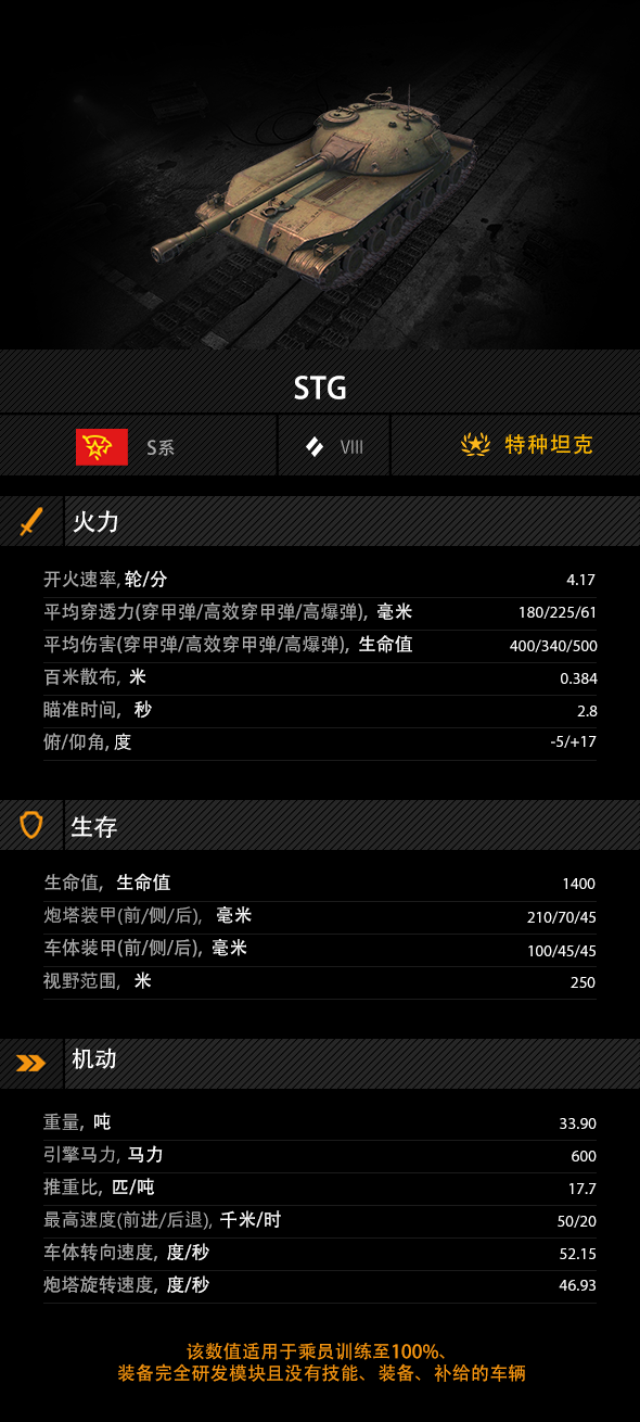 火力方面,STG搭载一门122毫米主炮,拥有光速缩圈的特点,可在短时间内瞄准并完成射击。其平均穿深为180/225/61,平均伤害400/340/500,在装备中可选用输弹机进一步提升装填效率。结合低矮的车身与灵活的转向能力,STG擅长依托掩体快速射击后迅速回撤,也可近距离对敌方进行绕袭。