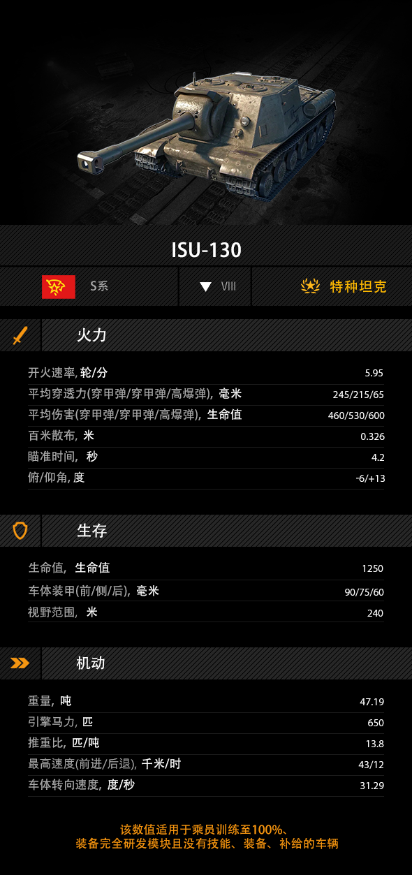 机动上,ISU-130拥有43千米/时的前进极速与12千米/时的倒车极速,配合可选的强化引擎,能胜任快速转场、配合包围或危急撤离等突发情况,在战局中保持战术灵活性。
