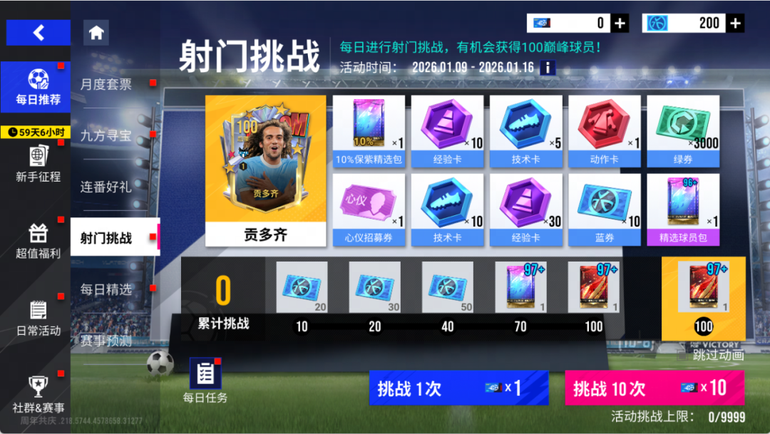新一期任意球挑战将于1月9日开启,完成挑战,获得丰富的奖励!