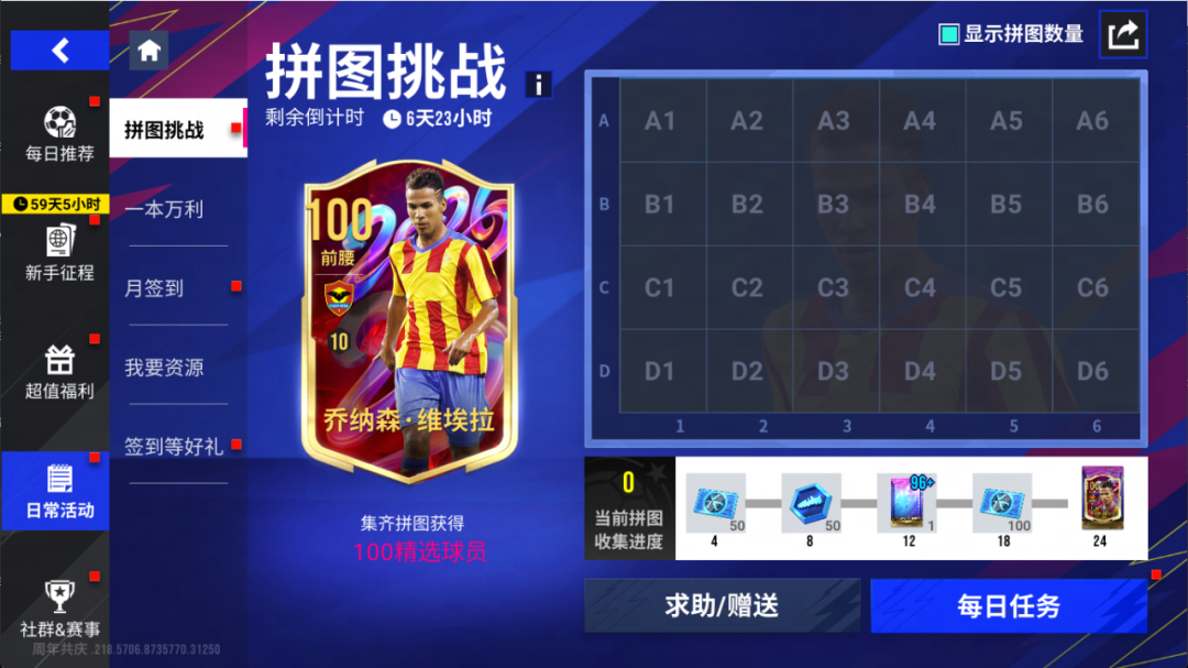 2026年1月9日11时-1月16日11时期间,集齐24块拼图碎片,即可领取100精选球员【维埃拉】,玩家可通过每日任务与好友交换获取拼图碎片。