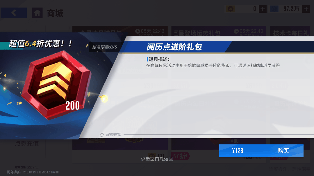 【阅历点进阶礼包】账号限购5次,购买可获得阅历点*200,仅需128元!