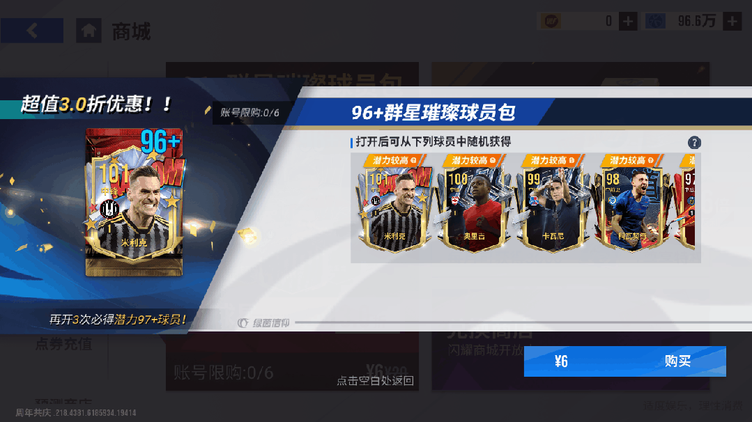 【96+群星璀璨球员包】账号限购6次。打开后可获得96-101潜力球员,打开3次必出97+,更有机会获得【101巅峰米利克】!