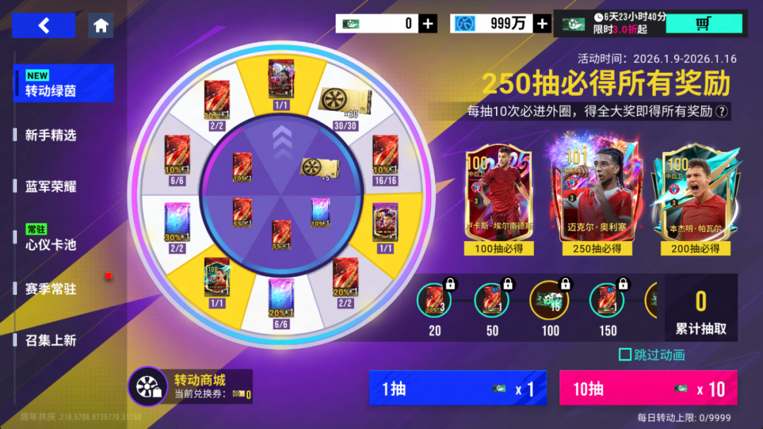 新一期转动绿茵将于1月9日11:00-1月16日11:00开启,101巅峰奥利塞隆重登场!本期大奖为:「101巅峰奥利塞*1」「100巅峰帕瓦尔*1」「100精选卢卡斯·埃尔南德斯*1」