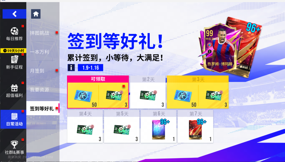 2026年1月9日11时-1月16日11时期间,每日签到即可领取96+巅峰球员包和「转盘券(限时)」等奖励。