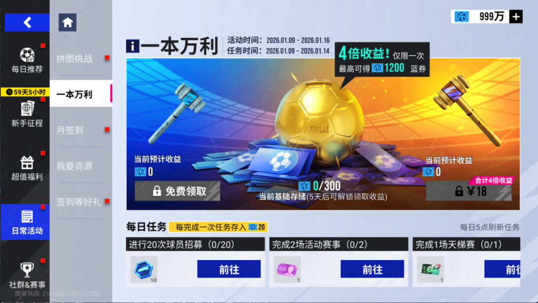 2026年1月9日11时-1月16日11时期间,玩家可通过完成任务进行预存蓝券,最终可领取300蓝券或付费解锁4倍蓝券奖励!
