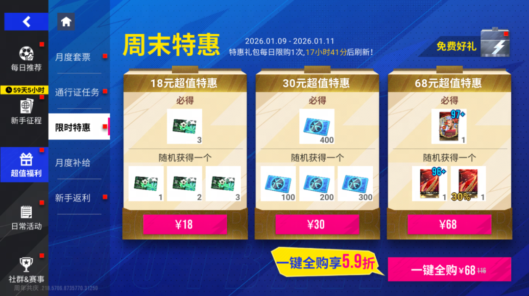 2026年1月9日11时-1月11日11时期间,【周末特惠】惊喜上线!每日登录可以以优惠的价格购买「97+巅峰球员包」「转盘券」等特惠商品,一次性打包购买更可享超值折扣!