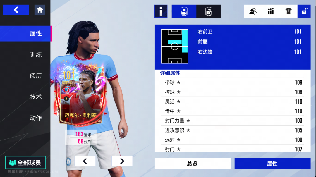 作为前场核心,他的威胁不止于此。【高速带球】技术与110的灵活属性相结合,赋予了他闪电般的变向启动能力。而【魔术师】技术配合109的带球属性,则让他在盘带时如入无人之境,能轻松突破防线,为球队打开局面。