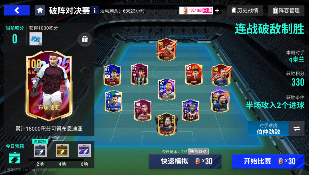 【破阵对决赛】1月9日11时至1月16日11时开启!玩家可以连续挑战随机对手,每次遭遇的对手阵容都是真实玩家的镜像阵容,获胜之后可以获取积分,累计积分必得100精选布恩迪亚!同时每日完成一定次数的挑战还能获得每日活跃宝箱。
