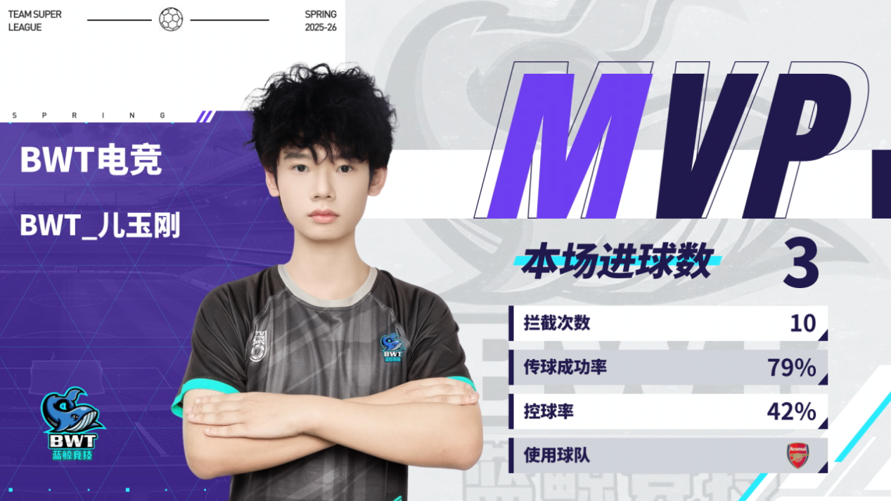 士气大振的BWT电竞乘胜追击,BWT_儿玉刚开场第一场进攻就取得进球,至此比赛就完全进入了他的节奏,最后适合,热苏斯反击中的一脚爆射即使被加西亚碰到,都无法阻止皮球飞入网窝!3:0轻取对手的儿玉刚不仅帮助队伍提前锁定三分,更是靠着如此优异的表现斩获本周MVP!