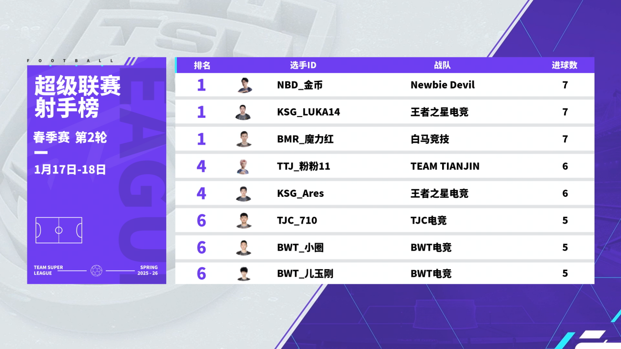 如此一来,本轮同样打入四球的LUKA14与魔力红本赛季进球数都来到了7球,他们与NBD_金币一起,暂时以7球共享射手榜第一!