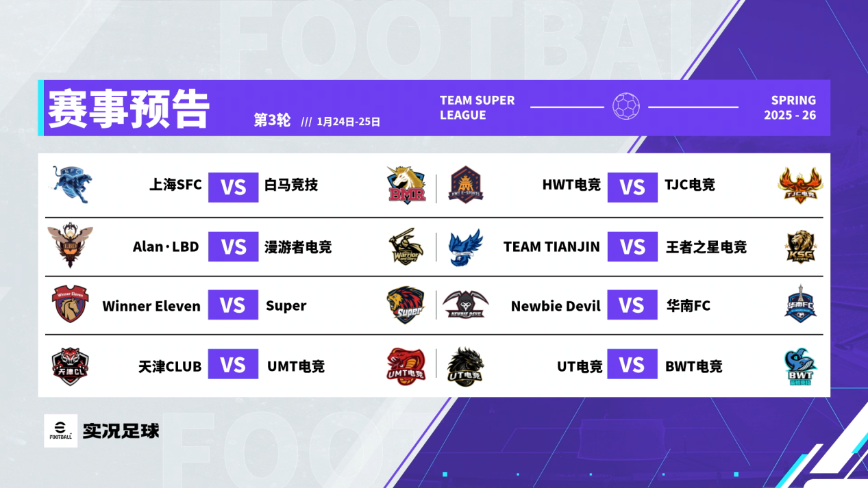 下周,我们将会看到多场重量级对决,目前分列积分榜二三位的王者之星电竞和TEAM TIANJIN狭路相逢,新老碰撞将会迸发出怎样的火花?粉粉11又能否顺利打入个人联赛生涯第200球?同样,TJC电竞大战HWT电竞的比赛也充满看点,每周六、日晚19:00,锁定「实况足球」官方直播间,各大平台同步直播!我们一起为下一球呐喊,为选手加油助威!