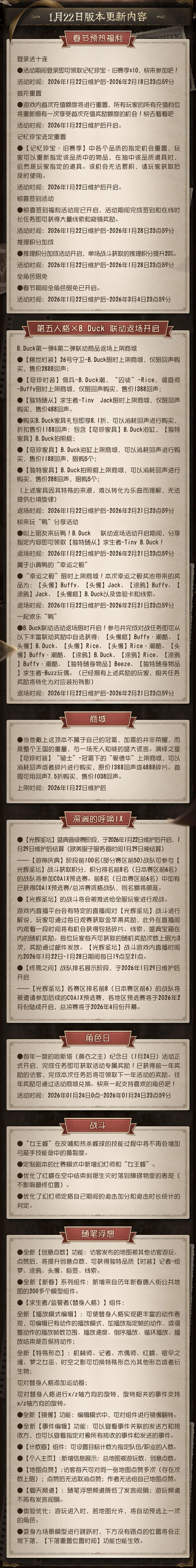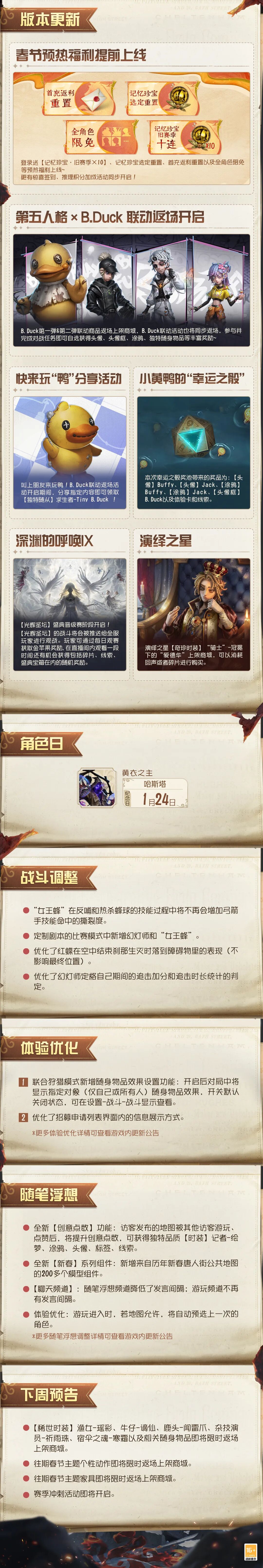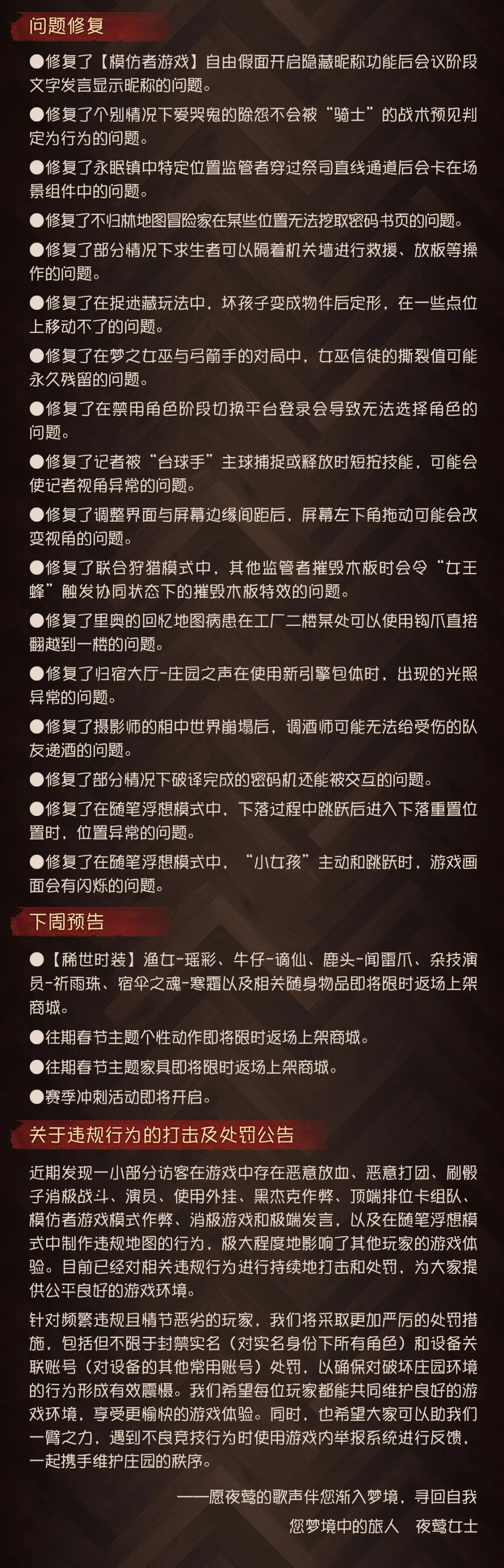 致诸位尊敬的访客: 欢迎来到【第五人格】! 为保证庄园的稳定运行,【第五人格】将于周四上午07:30进行停服维护,还望大家谅解并耐心等待。 本周维护时间为2026年01月22日07:30,预计维护2小时,届时庄园将会暂时无法进入; 若预计时间内维护没有完成,开服时间将会顺延,望诸位能够谅解。