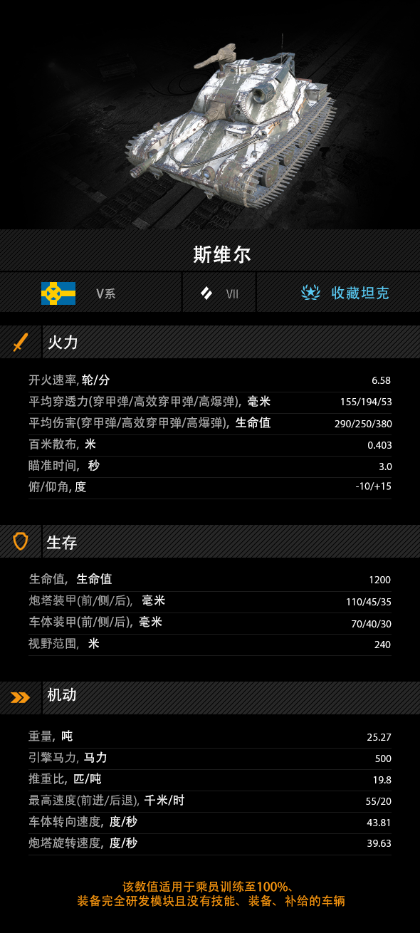 斯维尔最高前进速度55千米/时,倒车速度20千米/时,机动能力出色。可迅速抵达关键战术位置,凭借高机动性实施远距离黑枪,游刃有余地掌控战场节奏。炮塔装甲110/45/35,车体装甲70/40/30。其装甲不适宜与敌人正面硬拼。应充分发挥其优异的机动性,通过灵活游走与侧翼偷袭来获取战场优势。