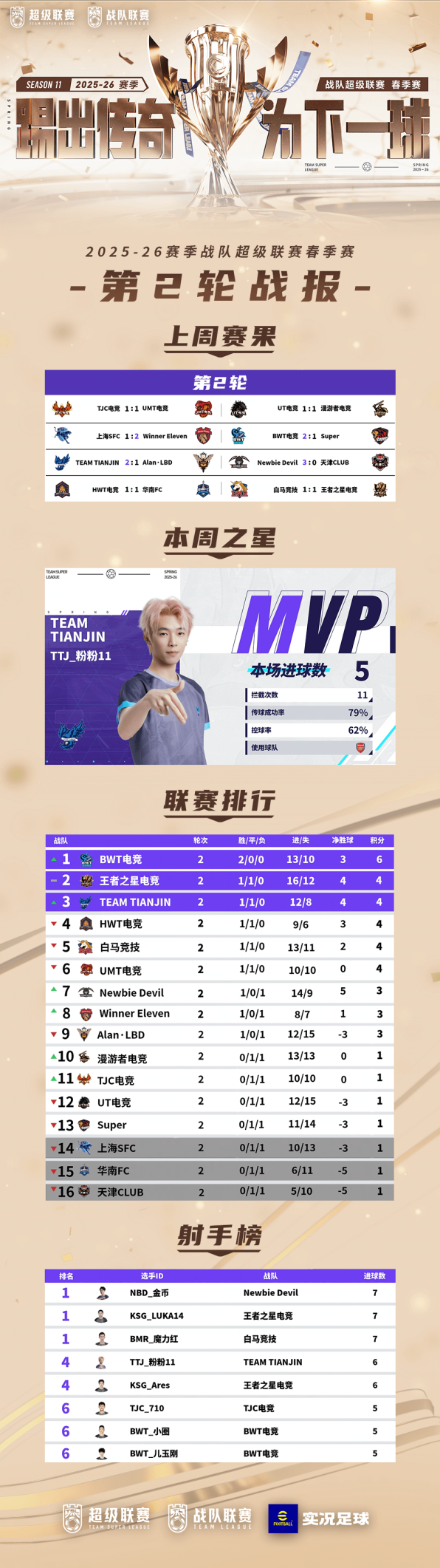 第2轮五佳球和「本周之星」TTJ_粉粉11精彩表现!