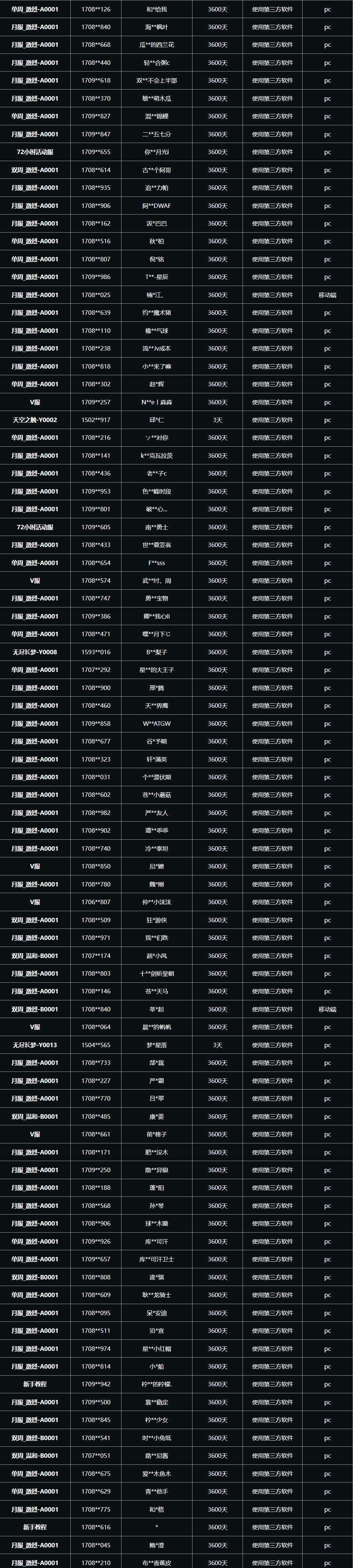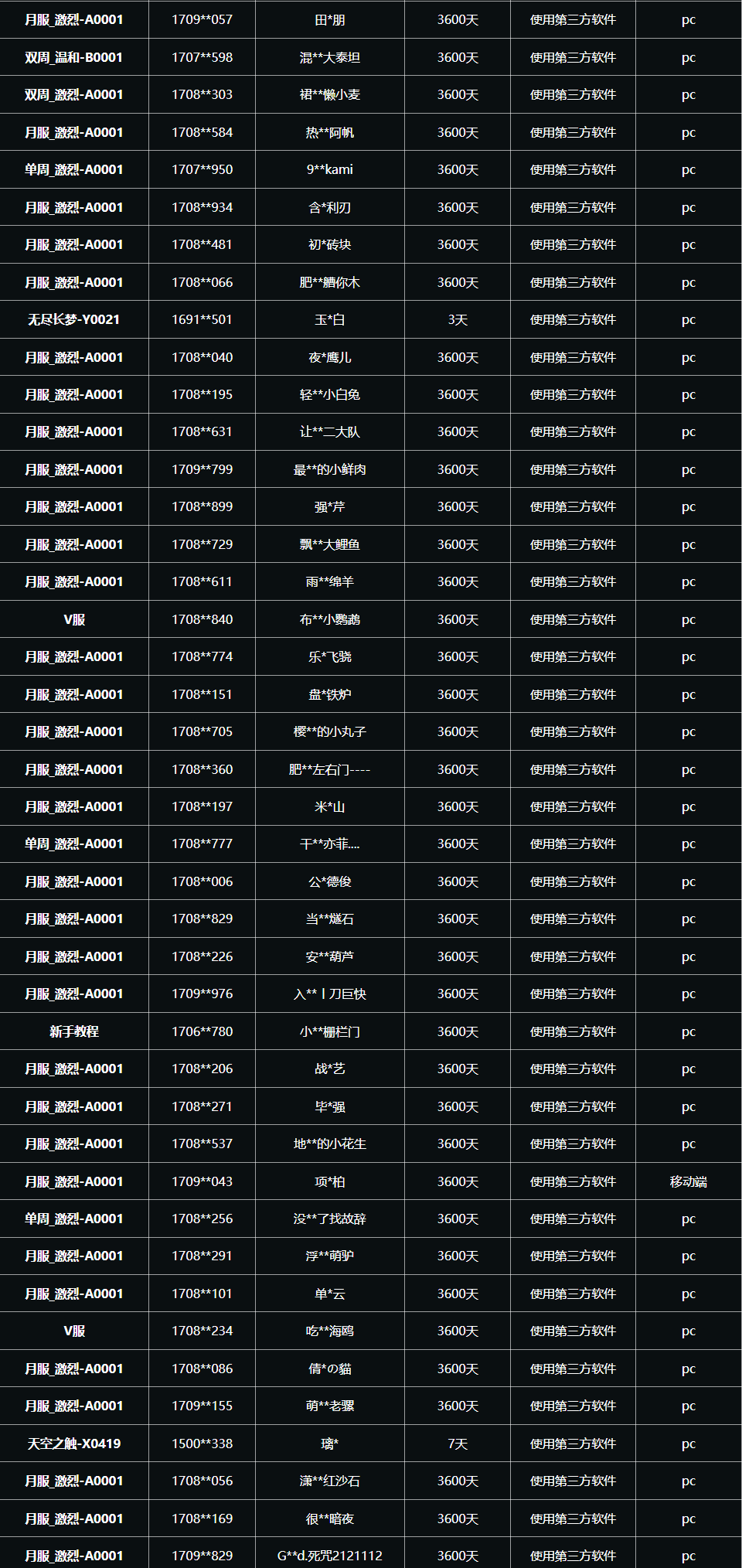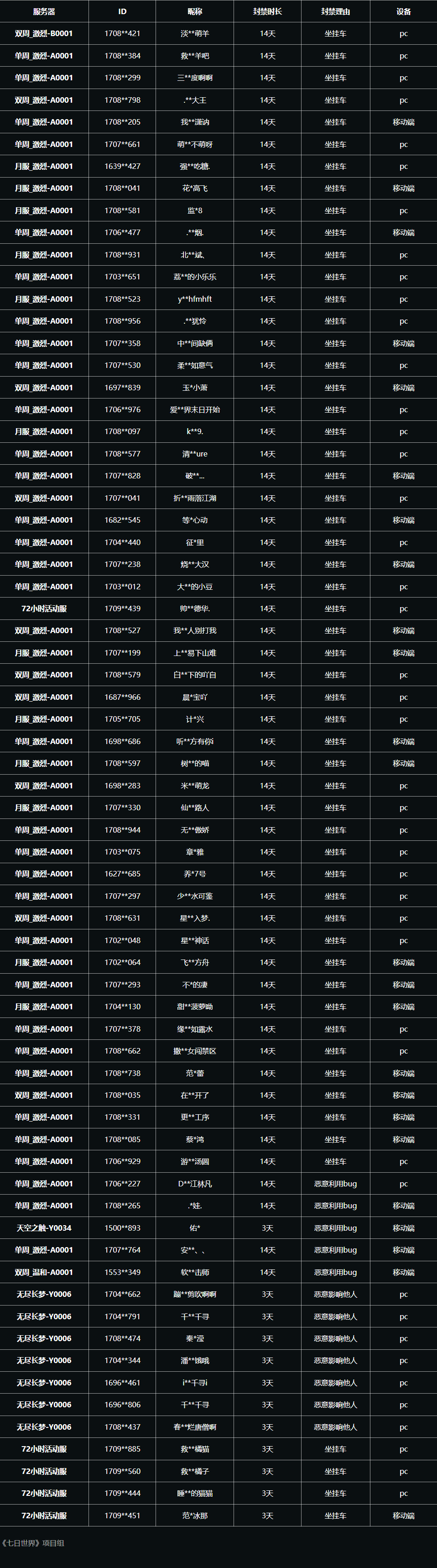 以下为近期因违规处罚情节较重的玩家公示名单,相关角色已进行复核,违规属实。如有任何疑问,请通过游戏内客服进行反馈。