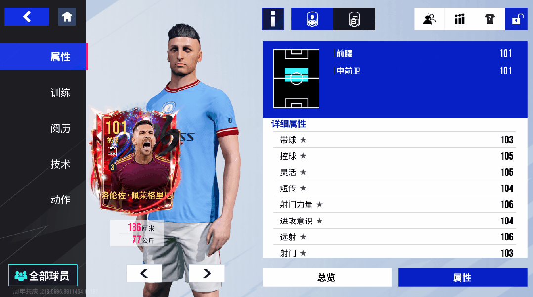 这张 101 巅峰佩莱格里尼搭载了金色【精密带球】技术,105 的控球属性配合该技术,让他在中低速盘带时的触球频率显著提升、转向摆脱的灵活性大幅增强,持球推进时的节奏感和变向能力直线飙升,堪称中场持球推进的 “节拍器”。金色【重炮】技术与 106 的射门力量、106 的远射属性相辅相成,让他能在禁区外完成势大力沉的精准轰门,将对手的防线直接洞穿;104 的短传 和 105 的长传优势,让他在完成控球后能第一时间梳理进攻,成为球队由守转攻的关键发起点。