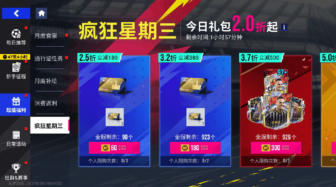 【疯狂星期三】仅在周三12-14时、18-20时与21-23时开启,全服玩家都可参与,活动期间可用超低价购买超值商品,每件商品均有限购数量,售完即止。