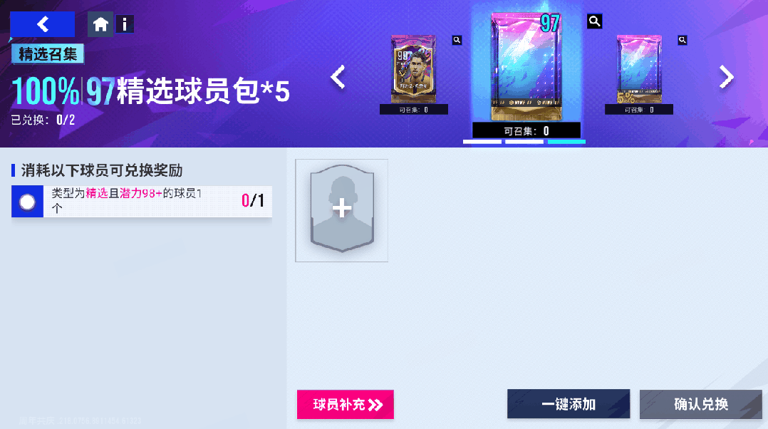 【97精选随机包】活动期间每日可进行2次召集挑战,按条件使用1个98精选球员进行召集,可拆分获得5个【97精选随机包】。