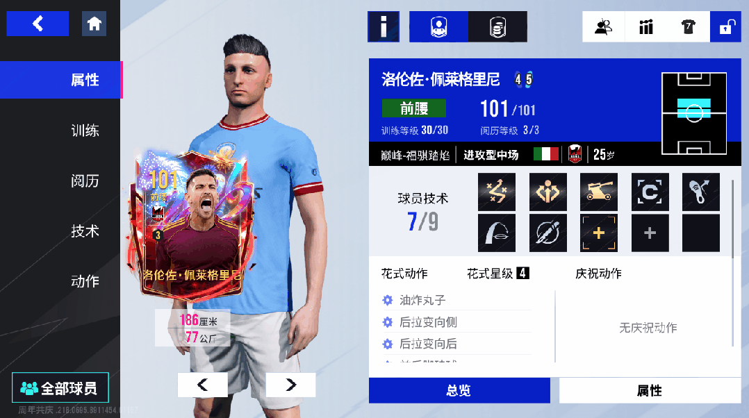 身为中场指挥官,佩莱格里尼的球场覆盖力堪称全能:106 体力搭配充沛的续航能力,让他能全场保持高效活力,从本方禁区前沿到对方禁区弧顶的每一寸区域都有他的身影;他用金色【高位逼抢】技术提前切断进攻串联,再配合 96 的拦截与 96 的抢断属性,即便面对技术型球员也能稳稳限制对手。攻防两端的极致表现,让他成为球队中场不可撼动的 “进攻核心 + 精神领袖”。