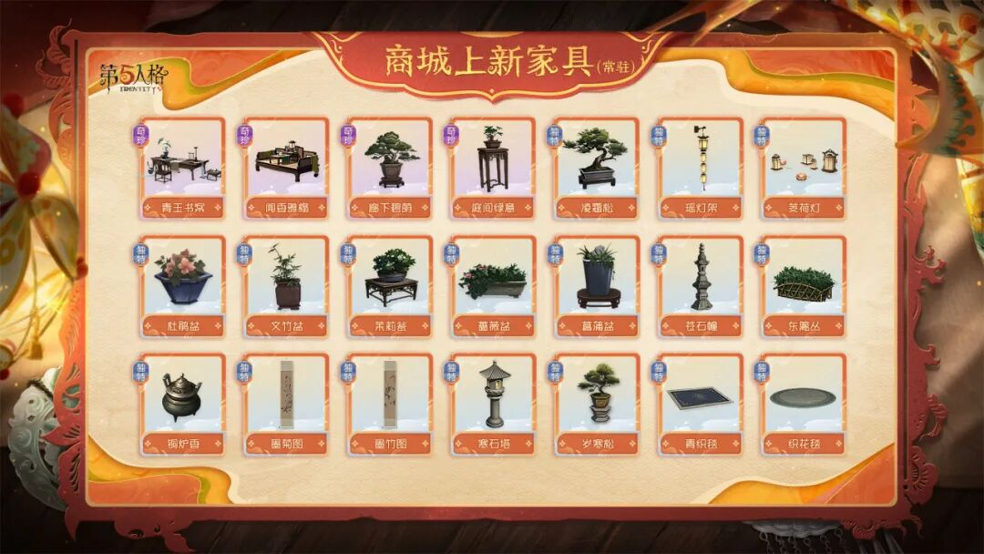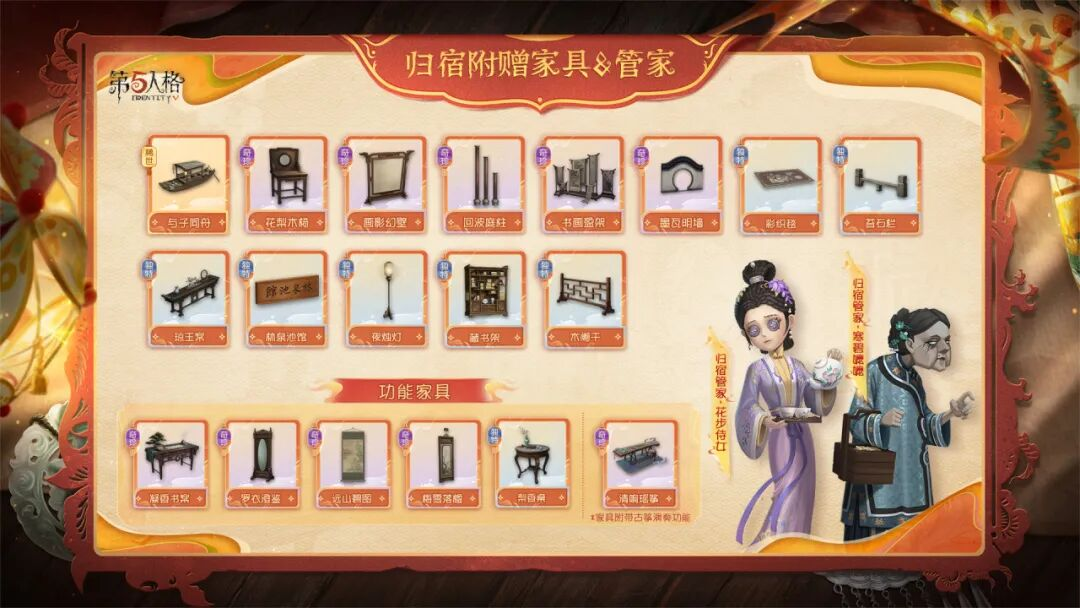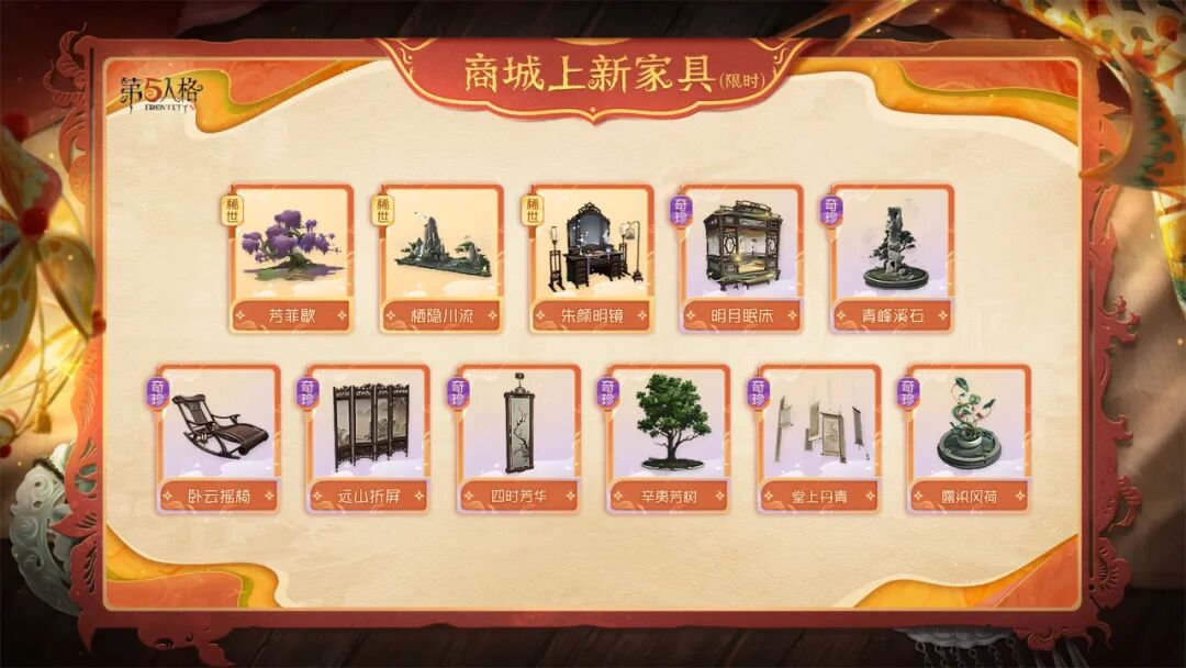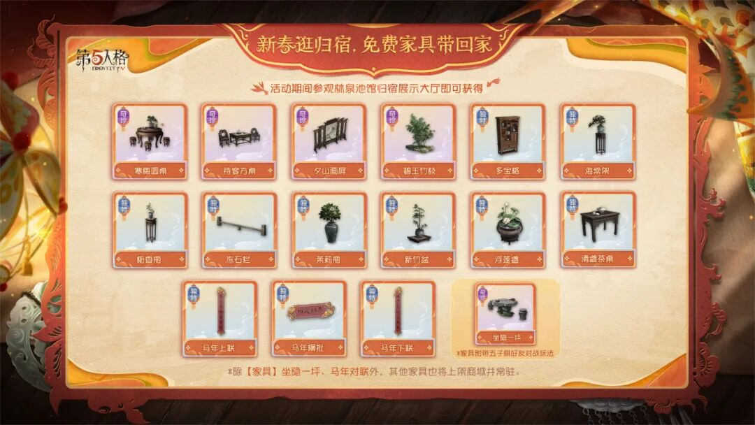 林泉池馆的归宿展示大厅将同步开启,可通过活动入口进入参观全新的归宿大厅以及带有节日氛围的家具搭配, 参观后不仅可以获得【奇珍家具】 坐隐一坪(可解锁五子棋好友对战玩法),还可以获得全新商城常驻家具奖励以及独特音符奖励!