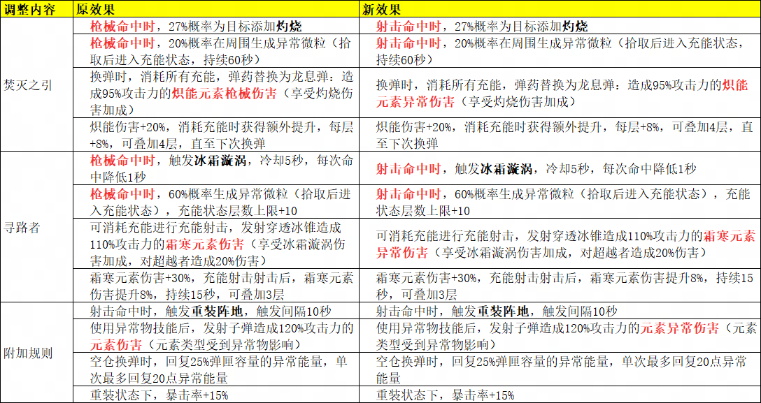 因此,我们将在本次更新后,统一将寻路者、焚灭之引、附加规则三把武器充能后的伤害类型从枪械伤害调整为异常伤害,调整后依然可以享受暴击/暴击伤害,弱点/弱点伤害加成。同时为了保证武器在充能和非充能状态下都能触发关键词,将关键词的触发条件统一为射击命中时。具体调整内容如下: