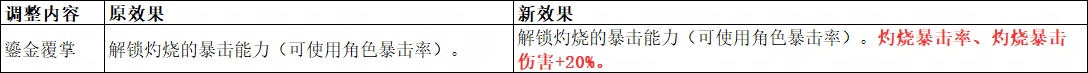 我们关注到装备鎏金覆掌相较于其他关键防具带来的增益略低于预期,主要原因在于暴击率不足使整体伤害较不稳定,本次平衡性更新对其进行增强: