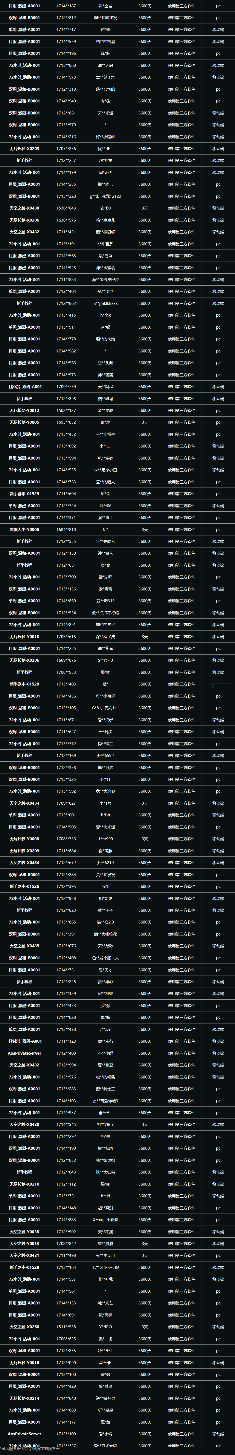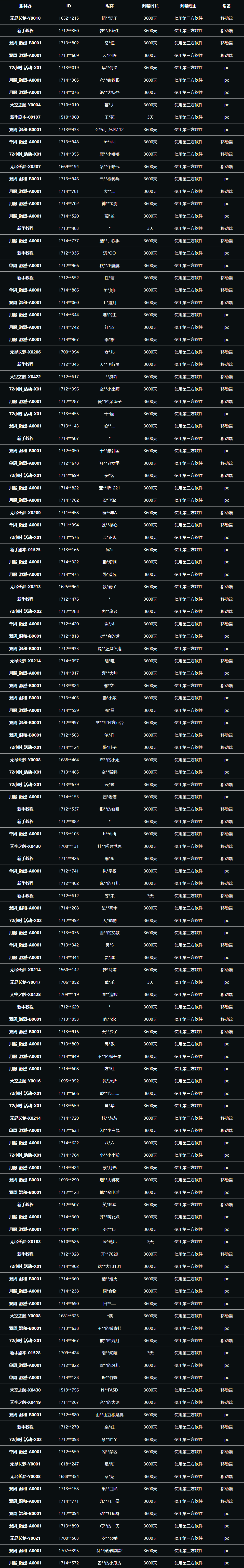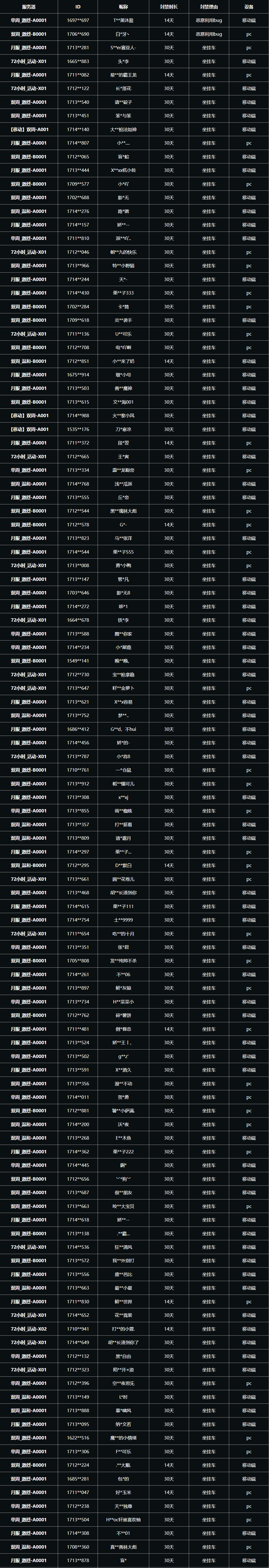 以下为近期因违规处罚情节较重的玩家公示名单,相关角色已进行复核,违规属实。如有任何疑问,请通过游戏内客服进行反馈。