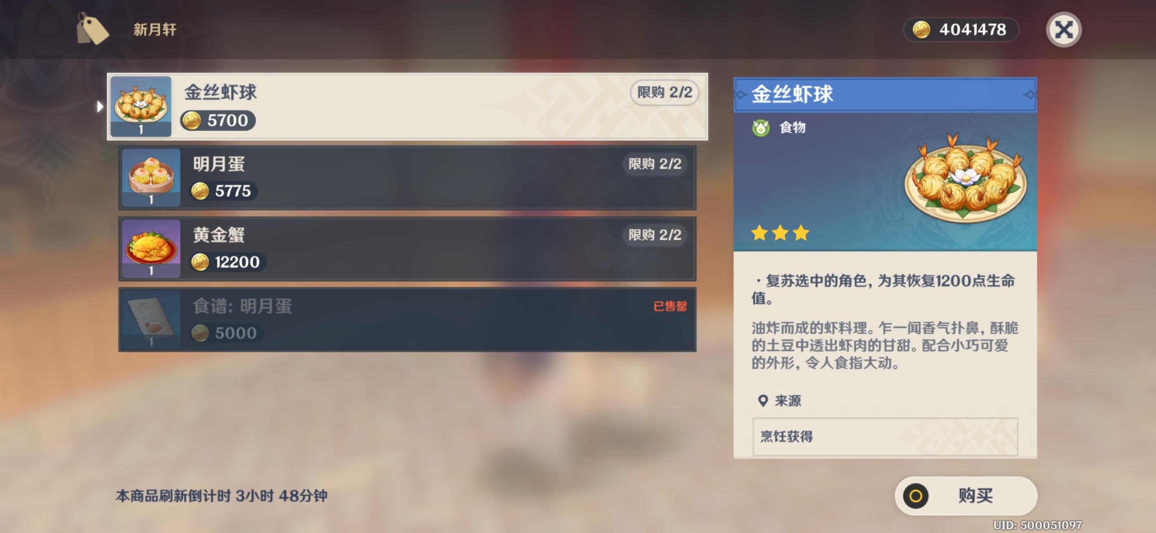 1.明月蛋(3星复活料理) 新月轩门口找女侍月疏购买