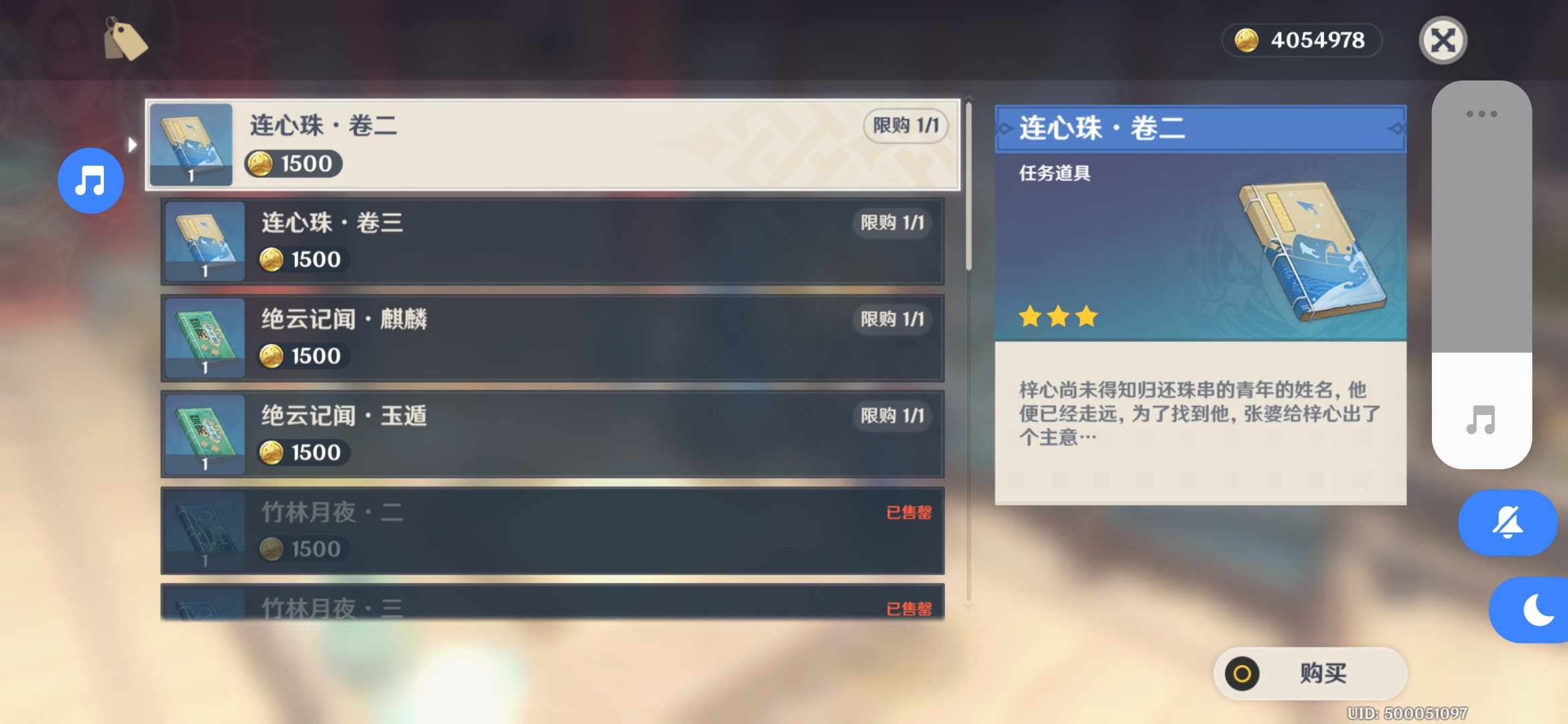 ,《连心珠·二》,《连心珠·三》各要1500摩拉,全部购买一共需要6000摩拉