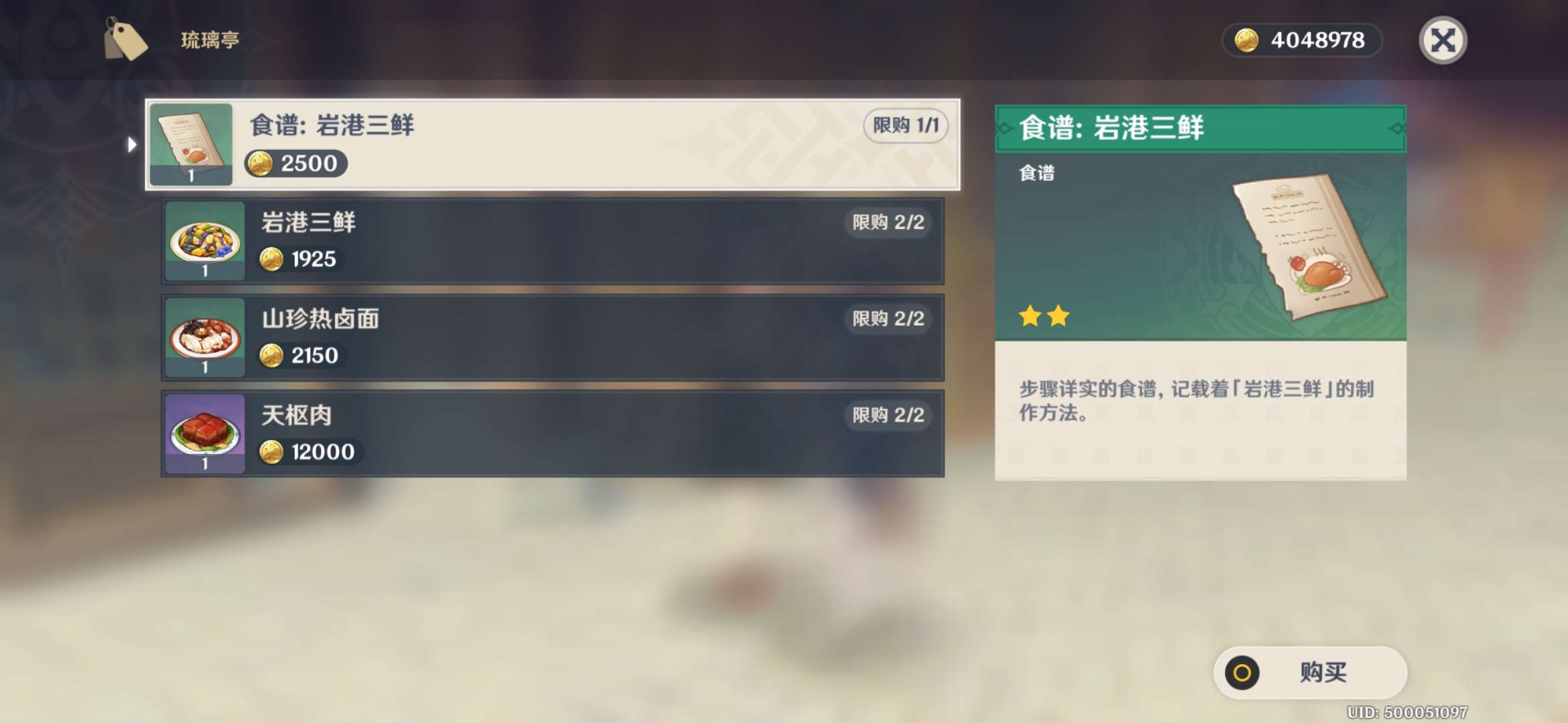 与他们对话就可以花5000摩拉购买明月蛋食谱和2500摩拉岩港三鲜食谱