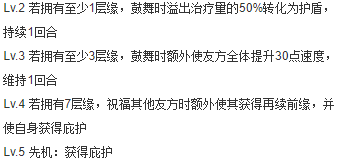 祝福1个友方目标,使其获得庇护,同时鼓舞非召唤物的友方全体,提升40%的伤害,并治疗非召唤物的友方全体生命上限9%的生命值,维持1回合。