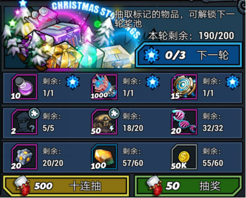 1. 一共有四轮奖池,奖励均有不同。只有抽到每一轮奖池的标记物品,方可解锁下一轮奖池。单抽一次消耗50圣诞袜,十连抽一次消耗500圣诞袜。