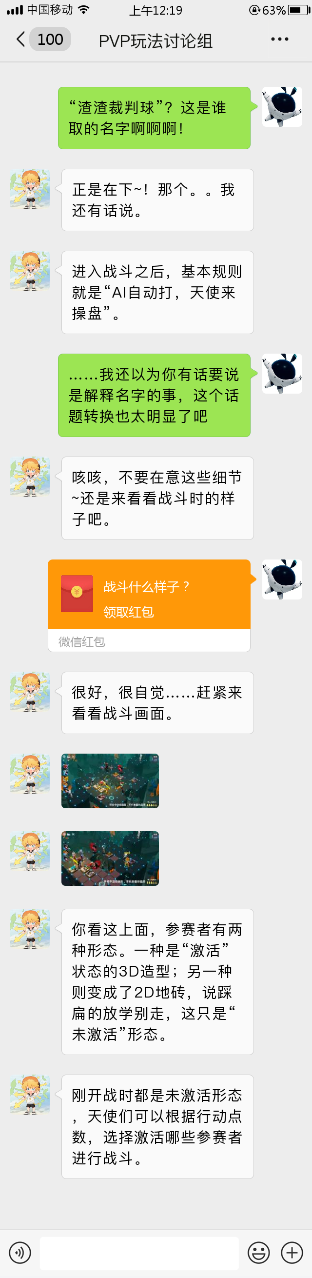 再说一遍,这只是第一个PVP玩法哦,未来还会设计更多。如果天使们有好的创意,欢迎以评论、发帖等形式提出来,帮助我们开阔思路。研发组的同学们一定会认真听取大家的建议,选取适合的创意加入到设计中。