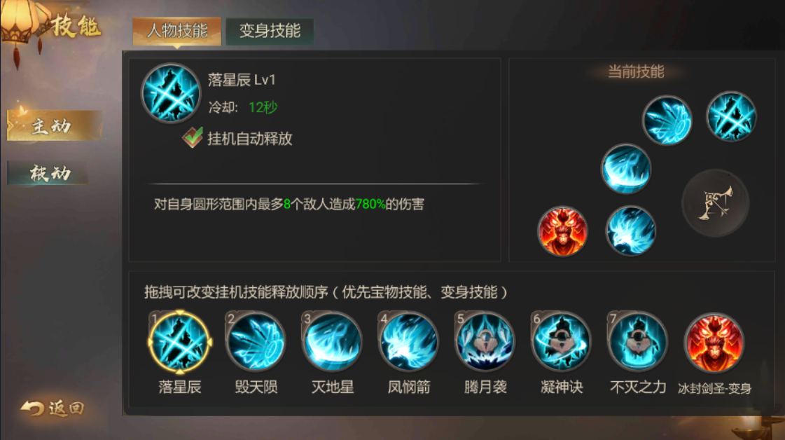 我们的技能分为主动技能和被动技能,主动技能的话有落星辰,毁天陨,灭地星,凤悯箭,腾月袭...等等技能可以帮助你打怪升级,不断修炼不仅如此,人物还可变身成冰封剑圣,并且使用该人物技能,变身持续35秒,登场回满生命,驱散不良BUFF,病无敌2秒,冷却时间935秒!