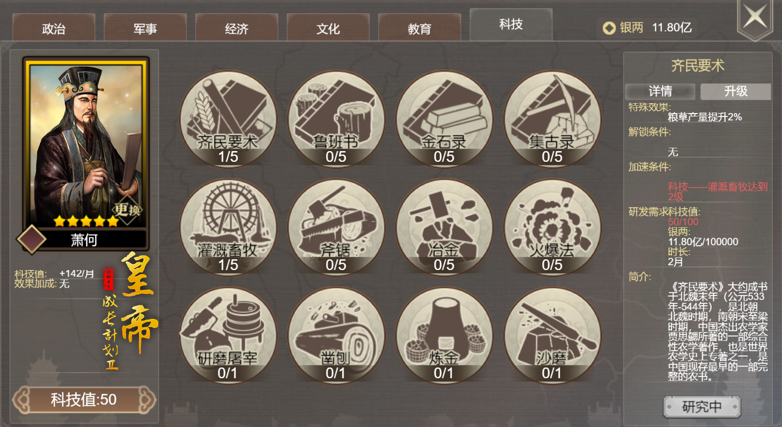 入口位于“宣政殿”-“工”部,可在此研究各种不同的知识,从而获得对应效果。(本次更新为科技类知识,其余知识将在接下来的版本中更新)