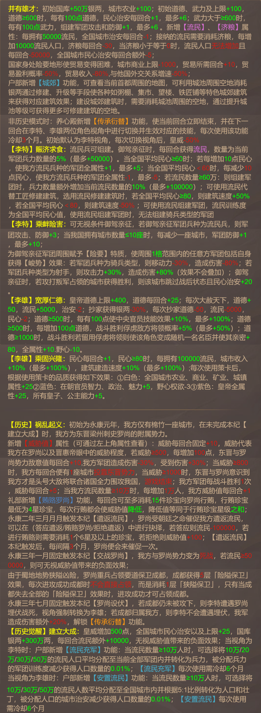 该部分为李特的个人技,突出展示出了草创过程中流民的重要性,他们不仅是战斗的主力军,更是重建的生力军。将个人道德属性同作战属性有机结合,既是对核心机制的体现,也是对得民心者得天下的遥相呼应。而御驾亲征时额外获得流民,也是暗自说明了起yi军会裹挟民众的史实。【峻势】效果使得流民无法组建骑兵的劣势反而在御驾亲征过程中变为了优势,这一设计确实贴切而富有趣味性。