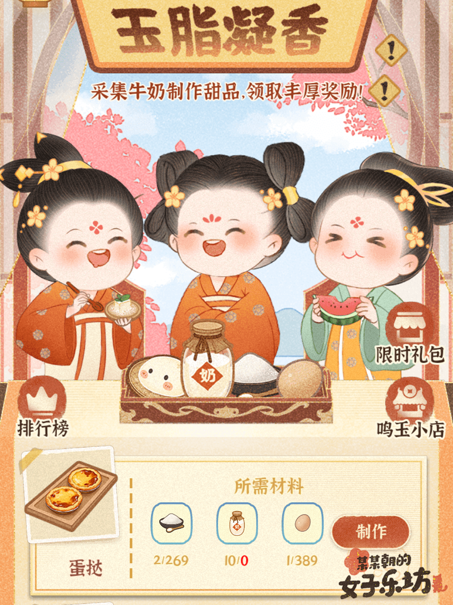 3、玉脂凝香,采集牛奶制作甜品,根据排名结算可获得限定金级学员[贝拉]、新头像框【大雪】