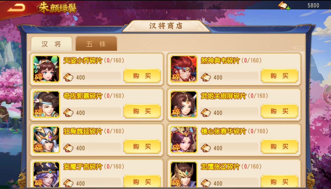 3、主公获得的「五铢钱」可以在五铢商店中兑换你想要的物品哦,原石、礼记周易、将星、洗练石、鲛油长明灯、北斗司南、金色万能神兵等海量道具和资源统统都有。