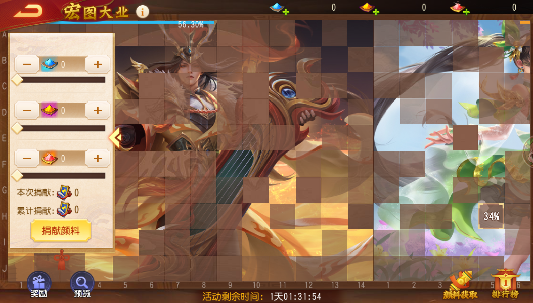 选择支持的阵营后,主公就能看到自己阵营的拼图啦,想要获得完整的拼图,那主公就得选择对应拼图块来捐献颜料,每一个拼图块进度达到100%时即可点亮,捐献需要用到颜料,主公可以通过两种方式来获得颜料,一个是完成活动中的每日任务,另一个是通过购买限时礼包获得。