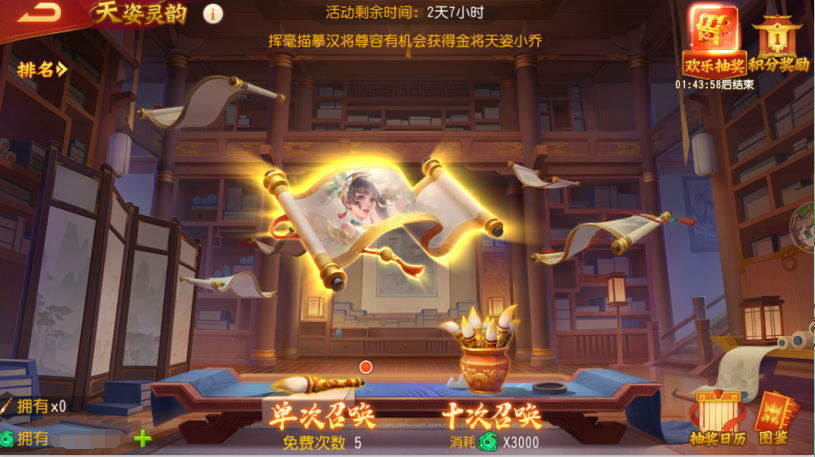 2、在抽奖开启期间,只要主公进行过1次挥毫,就能自动获得本轮抽奖的参与资格,挥毫次数越多,中奖概率越大;