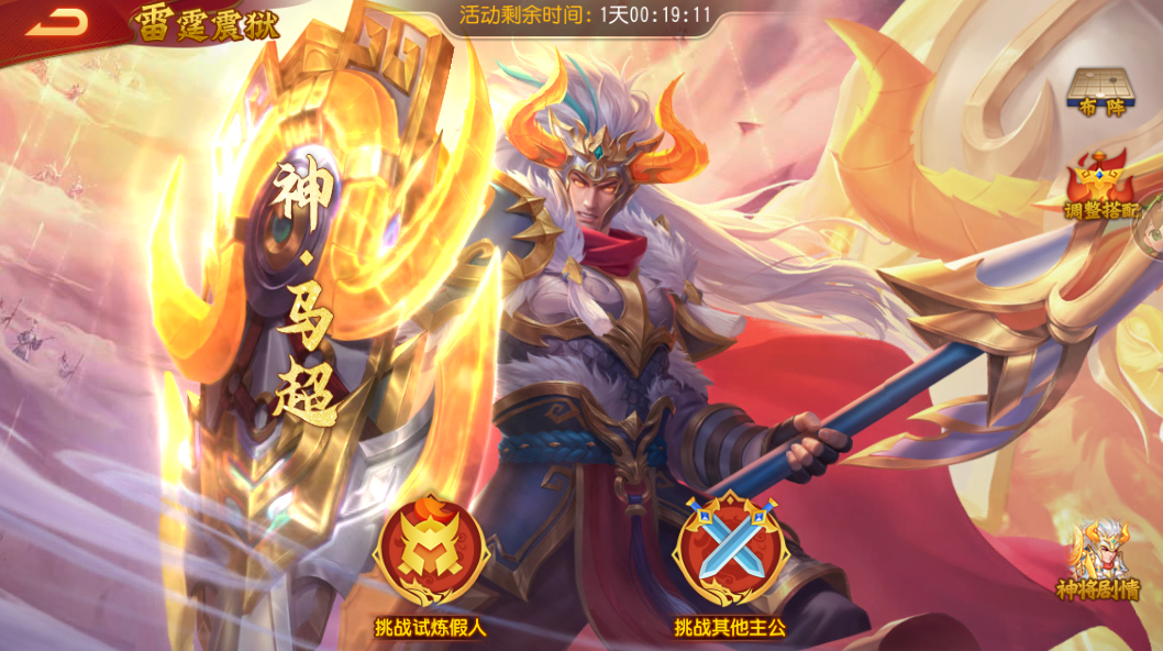 1、主公可招募试用武将神·马超,挑选试用阵容搭配来迎战强敌。