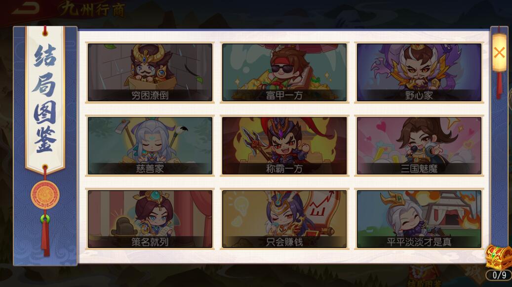 主公每次完成一轮九州行商都会达成一个或多个结局,首次激活结局可获得解锁奖励,解锁全部结局可获得额外奖励。结局评定与主公完成事件的情况和交易营业额数量有关,主公可自由探索,尝试解锁不同的结局哦。