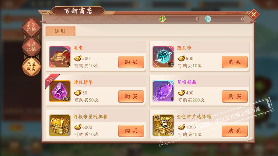 活动期间,少年们消耗元宝可购买一定数量的司南、蕴灵珠、时装精华、星宿凝晶、终极命星随机箱、兵书残卷、幻紫符选择箱、星魂选择箱、金色命星选择箱(20选1)、高级养成资源选择箱、基础养成资源选择箱等丰厚资源,应有尽有,不要错过哟。
